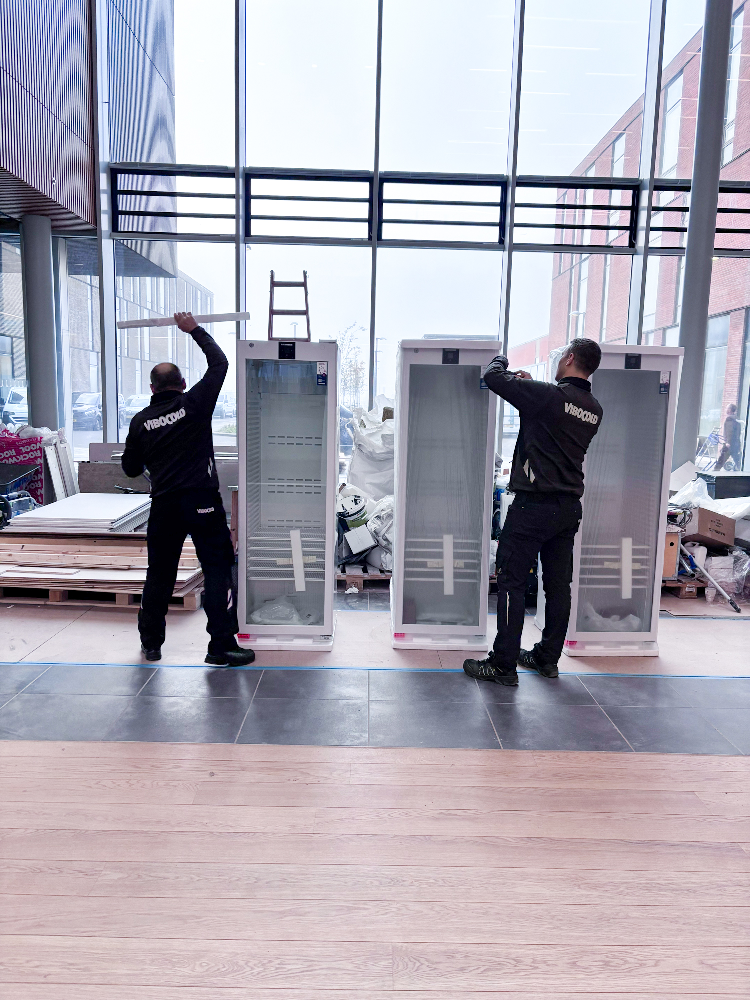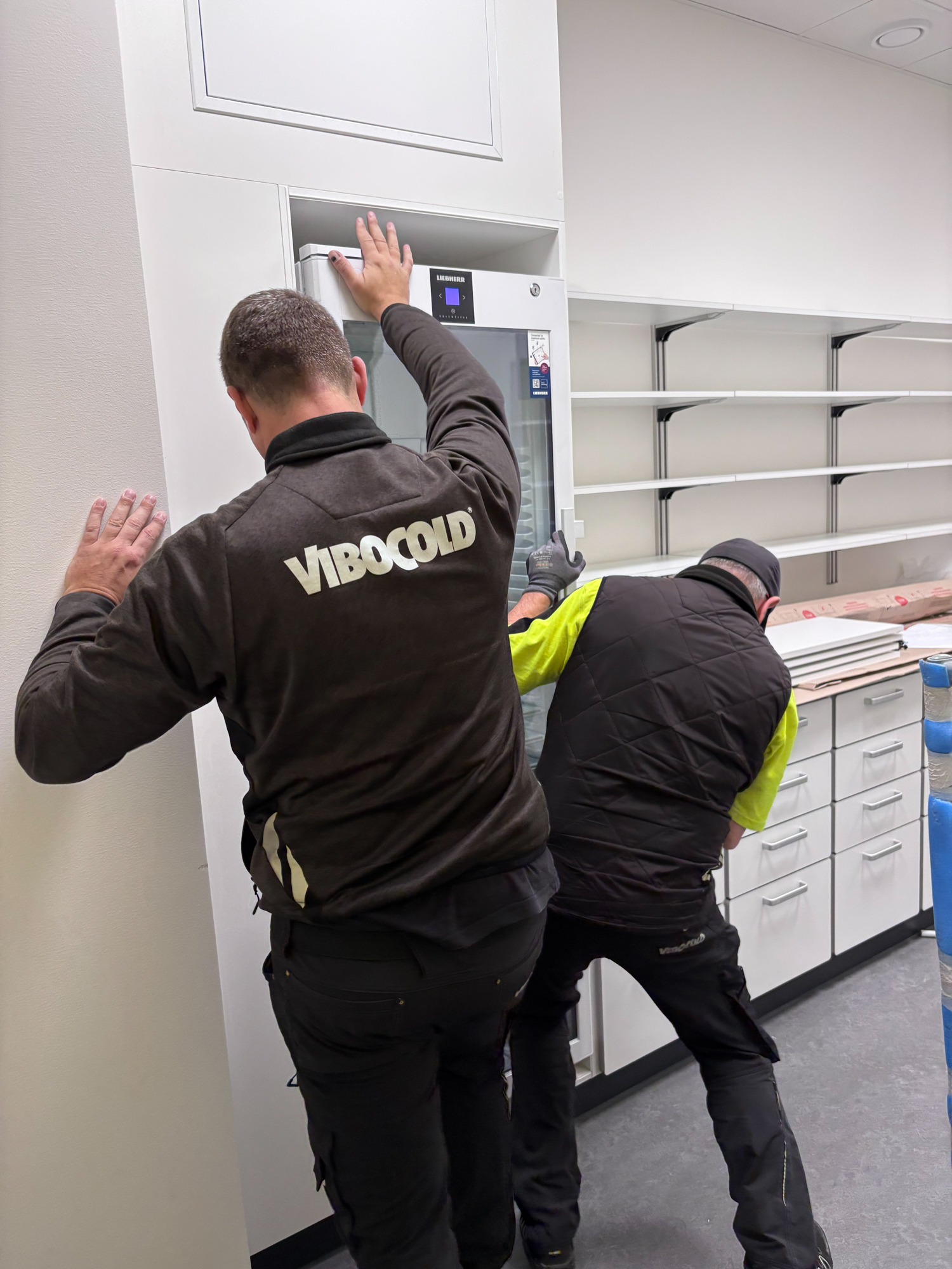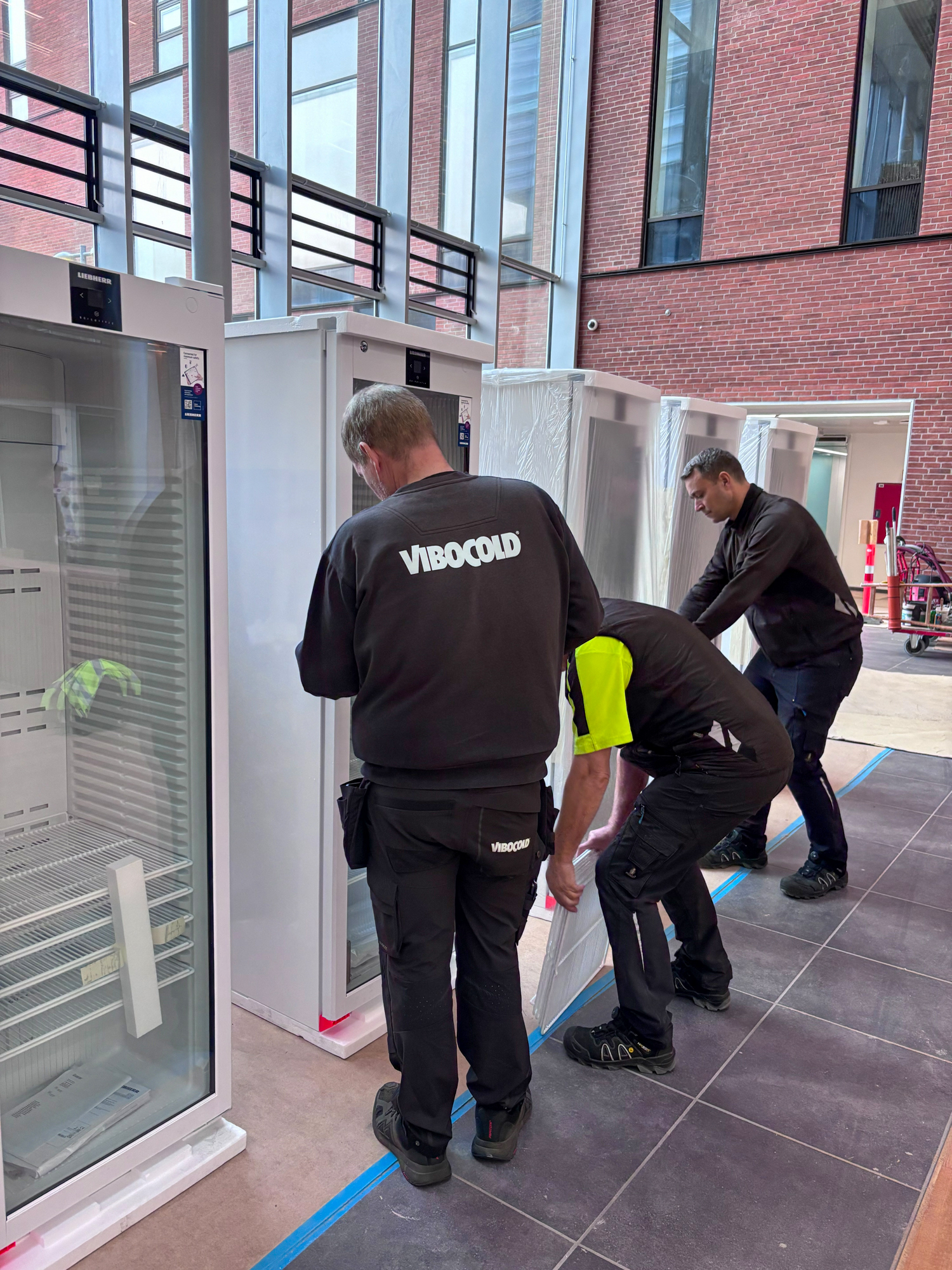 Hos Vibocold modtog vi alle 66 Liebherr medicinkøleskabe på vores lager. Her håndterede og ombyggede vi 40 af dem, så de fik venstrehængte døre. Samtidig blev alle skabe udstyret med fem ekstra trådhylder, så de passer perfekt til brugen i medicinrummene.