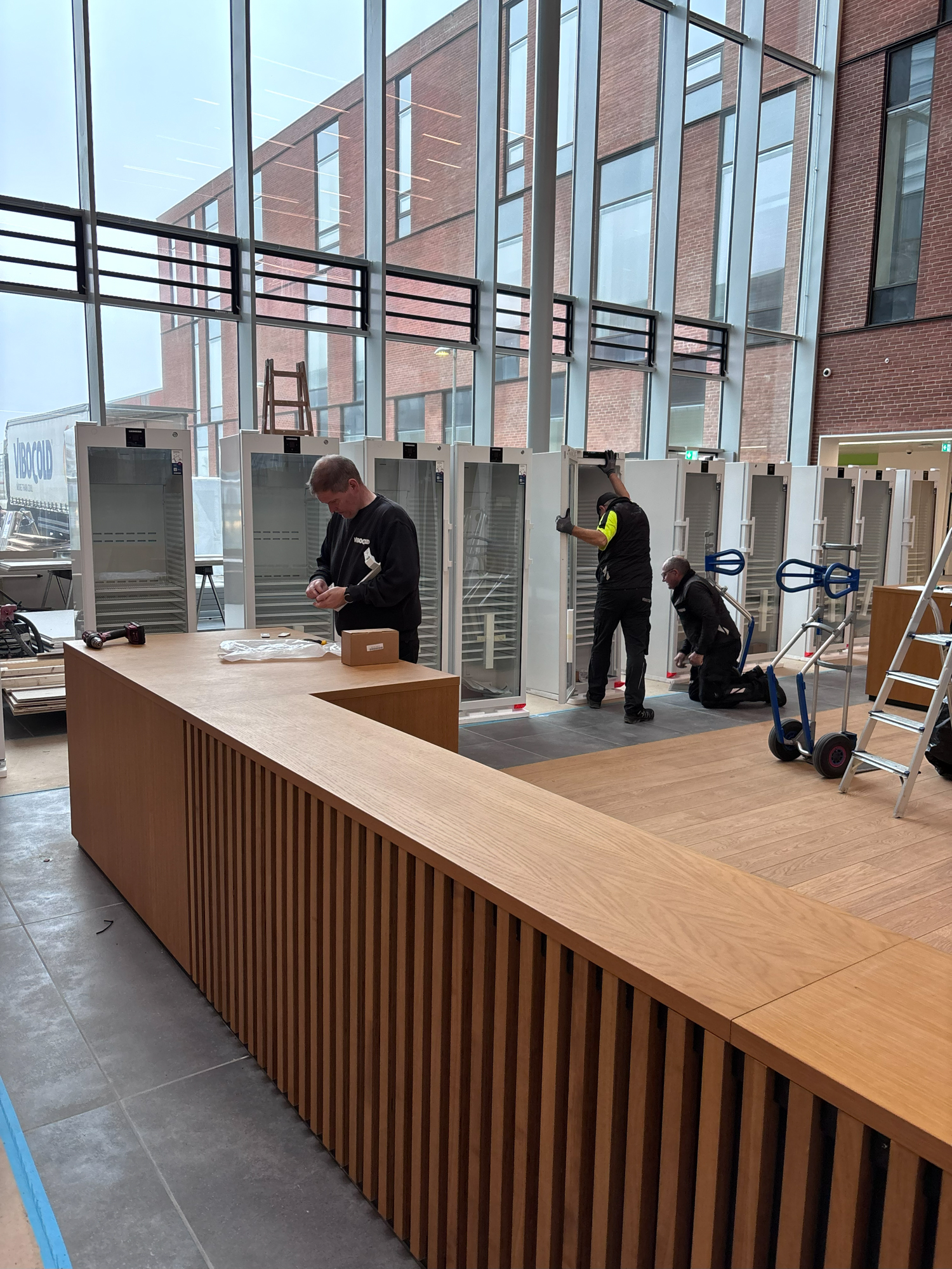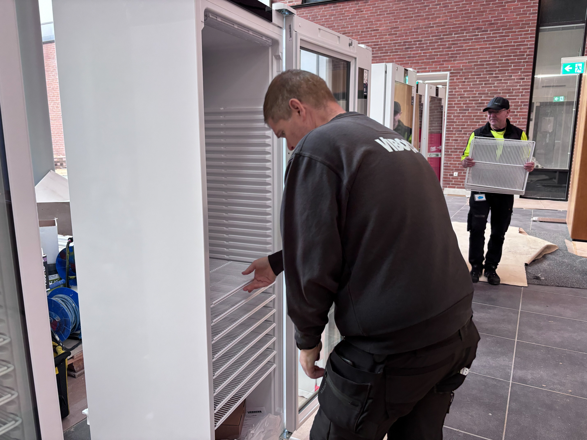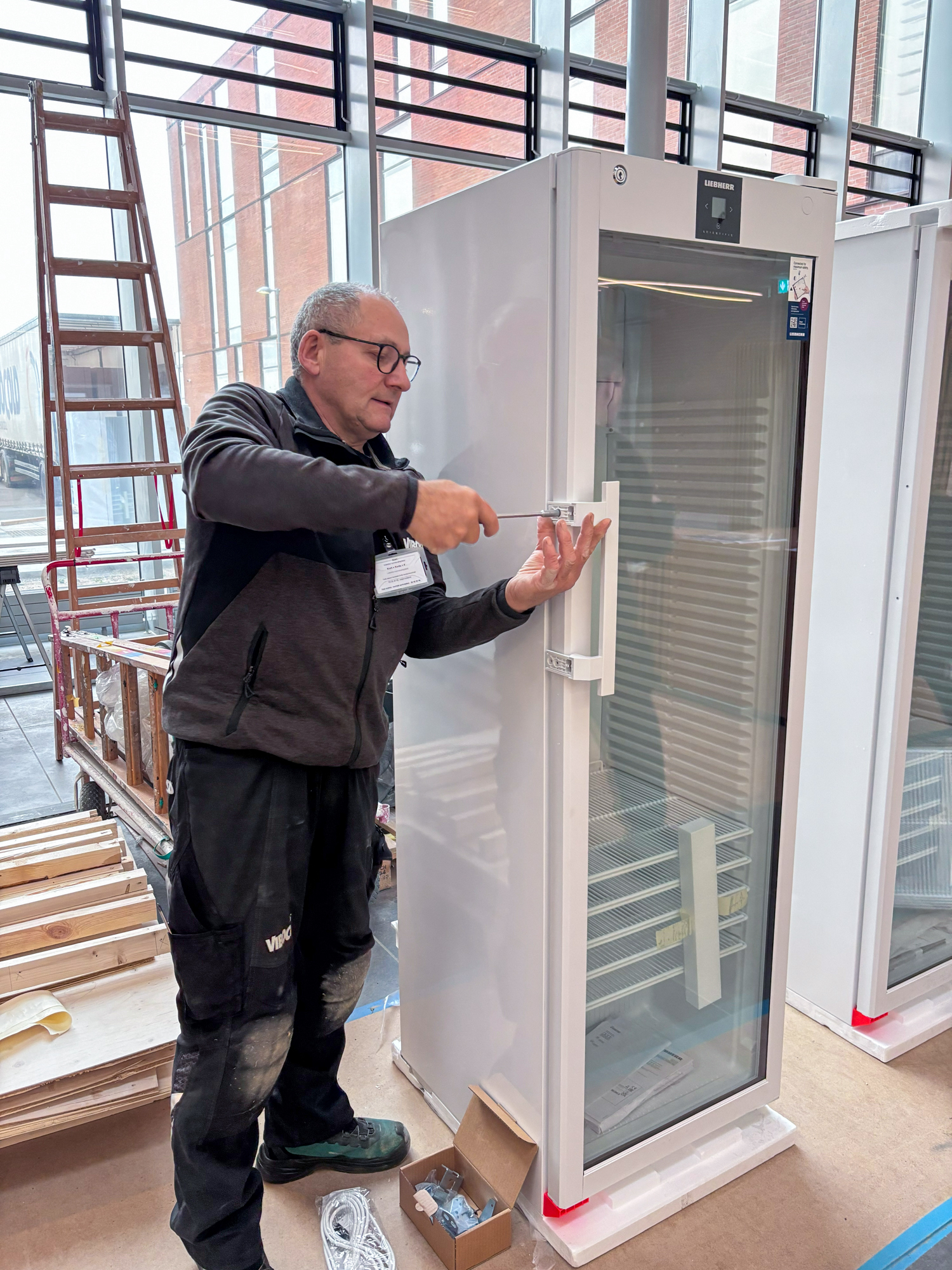 Hos Vibocold modtog vi alle 66 Liebherr medicinkøleskabe på vores lager. Her håndterede og ombyggede vi 40 af dem, så de fik venstrehængte døre. Samtidig blev alle skabe udstyret med fem ekstra trådhylder, så de passer perfekt til brugen i medicinrummene.