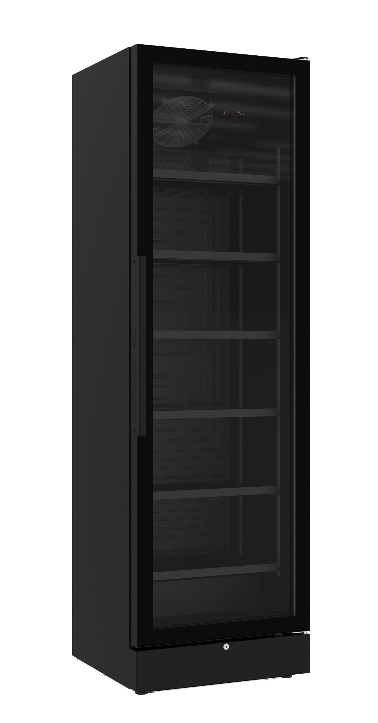 VD 390 EC SORT er udstyret med EC-ventilatorer og en avanceret elektronisk styring, der sikrer en præcis temperaturkontrol. Ventilatorerne tilpasser hastigheden efter kølebehovet, hvilket reducerer energiforbruget betydeligt. Denne teknologi gør køleskabet til et ideelt valg for detailhandlere, der ønsker at kombinere energieffektivitet med en pålidelig præsentation af deres drikkevarer.