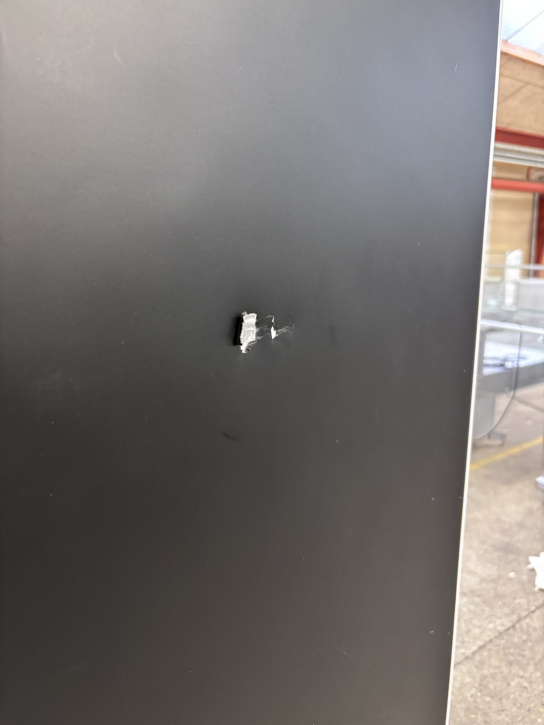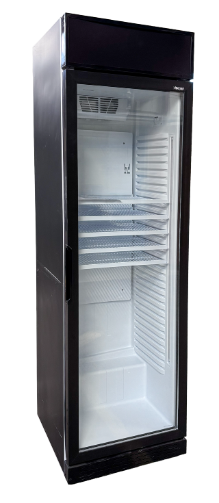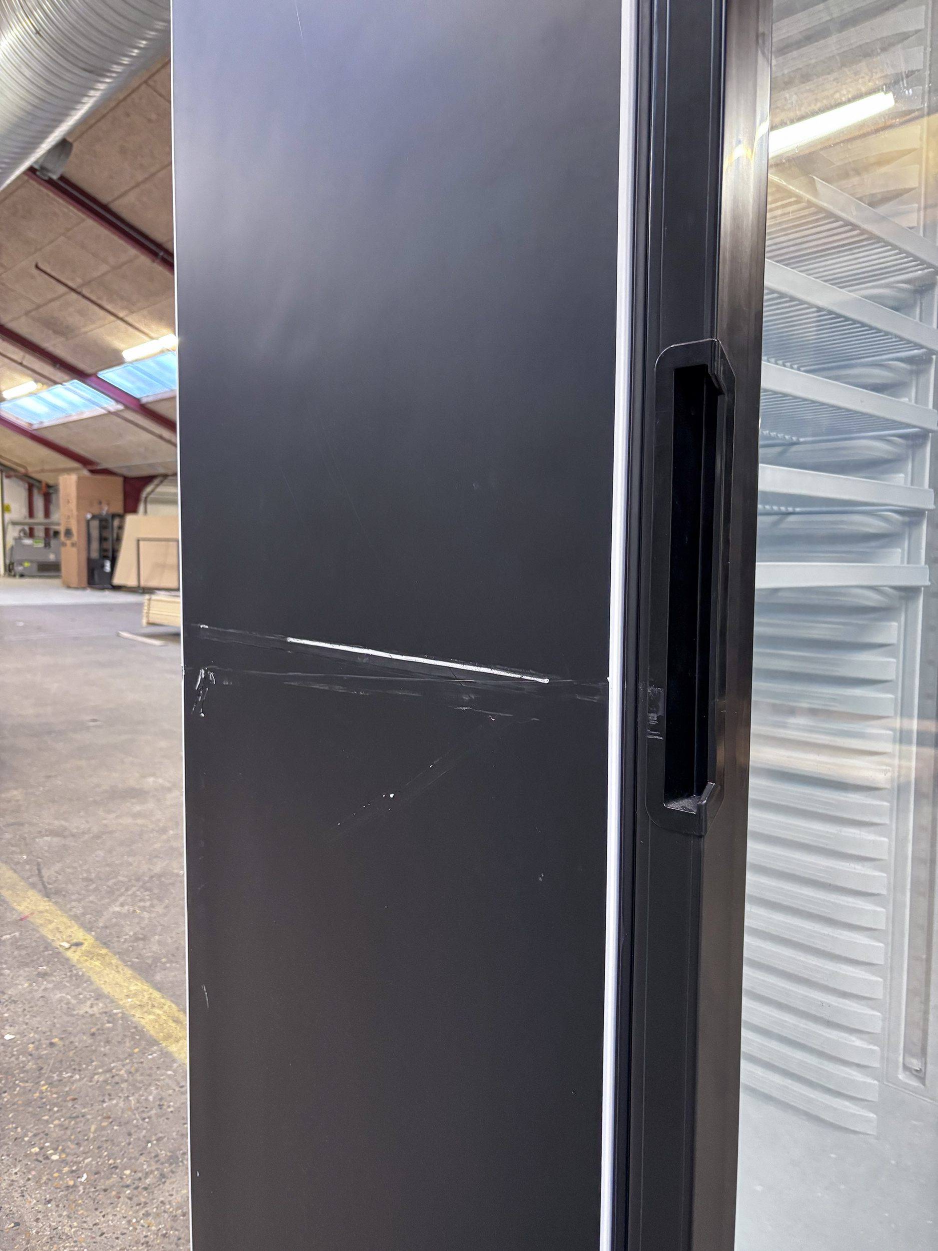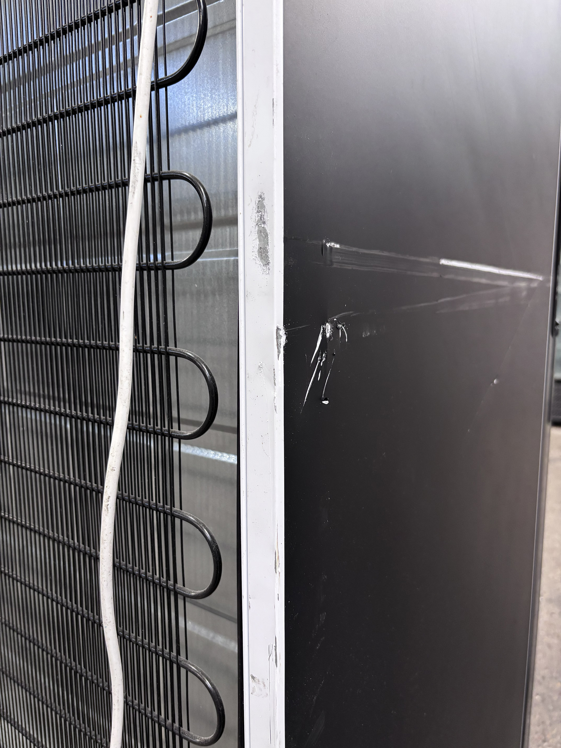Dette displaykøleskab er oprindeligt med en hvid finish, men er blevet opgraderet med sort folie på både siderne og lystoppen. Siderne har fået nogle ridser under håndtering, hvilket afspejles i den ekstra lave pris. Køleskabet har aldrig været brugt og fungerer helt perfekt.