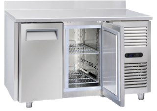 Et pladsbesparende frysebord i rustfrit stål med to selvlukkende døre og flytbare hylder. Perfekt til mindre køkkener eller som ekstra bord- og fryseplads i det større køkken.