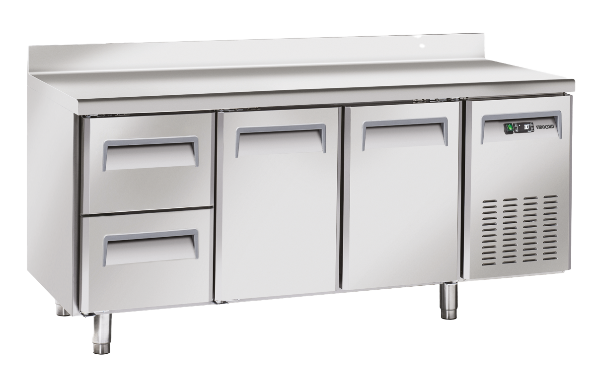 Med et kølebord som dette får du både masser af bordplads og masser af opbevaringsplads. Denne model har to skuffer samt to køleskabe med hylder.