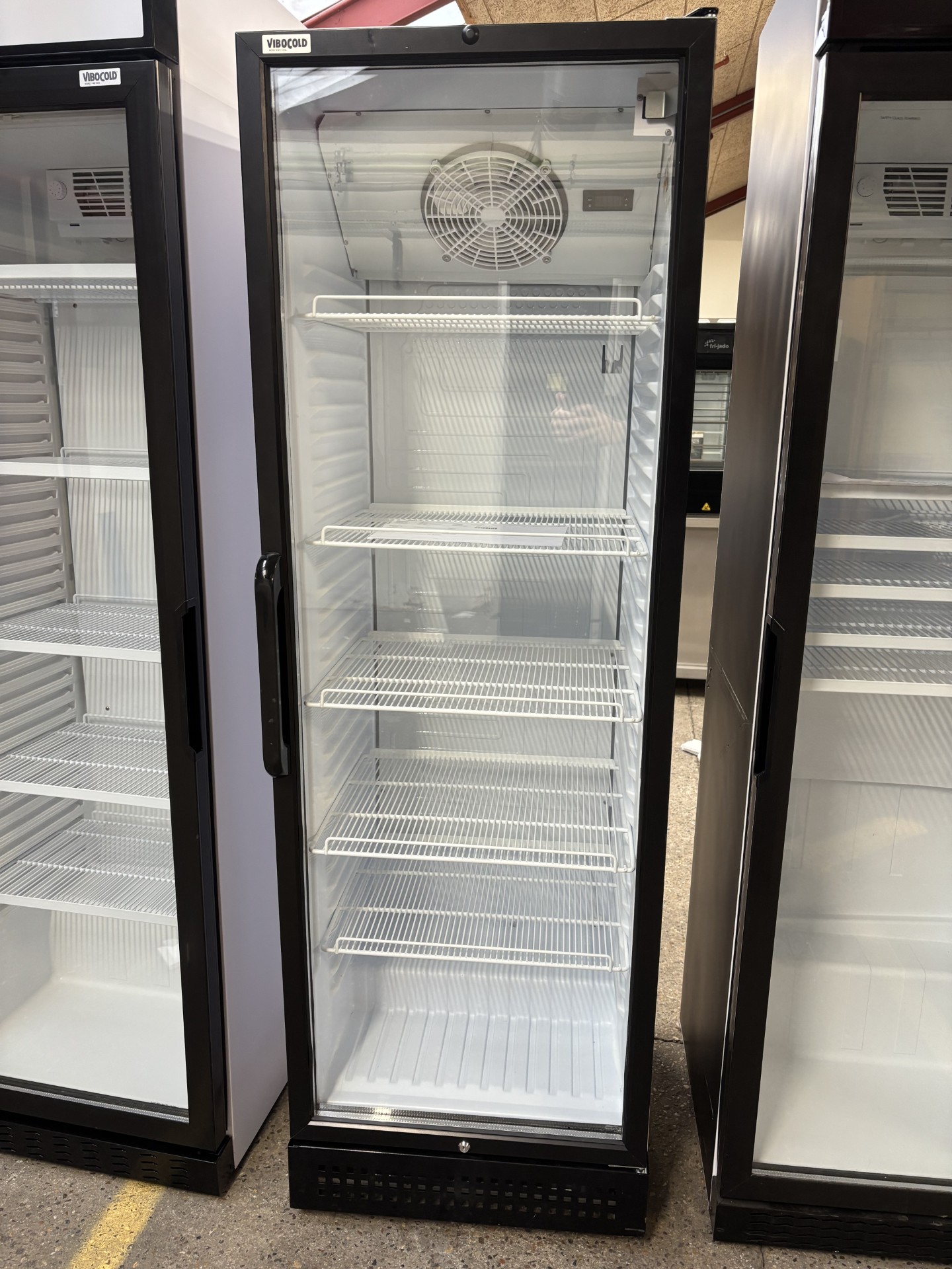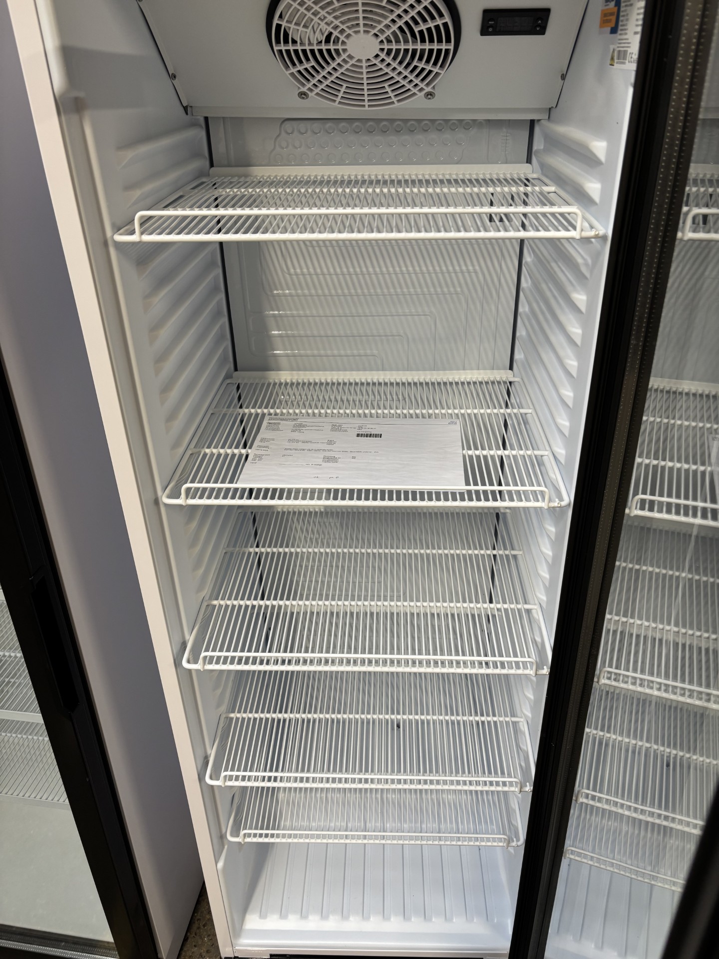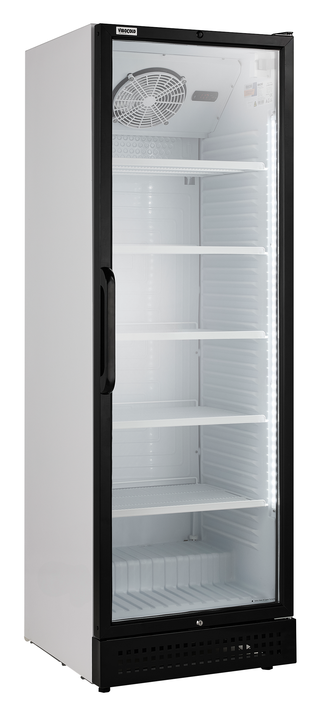 Klassisk displaykøleskab med vendbar, selvlukkende glasdør, LED-lys og fem justerbare hylder.